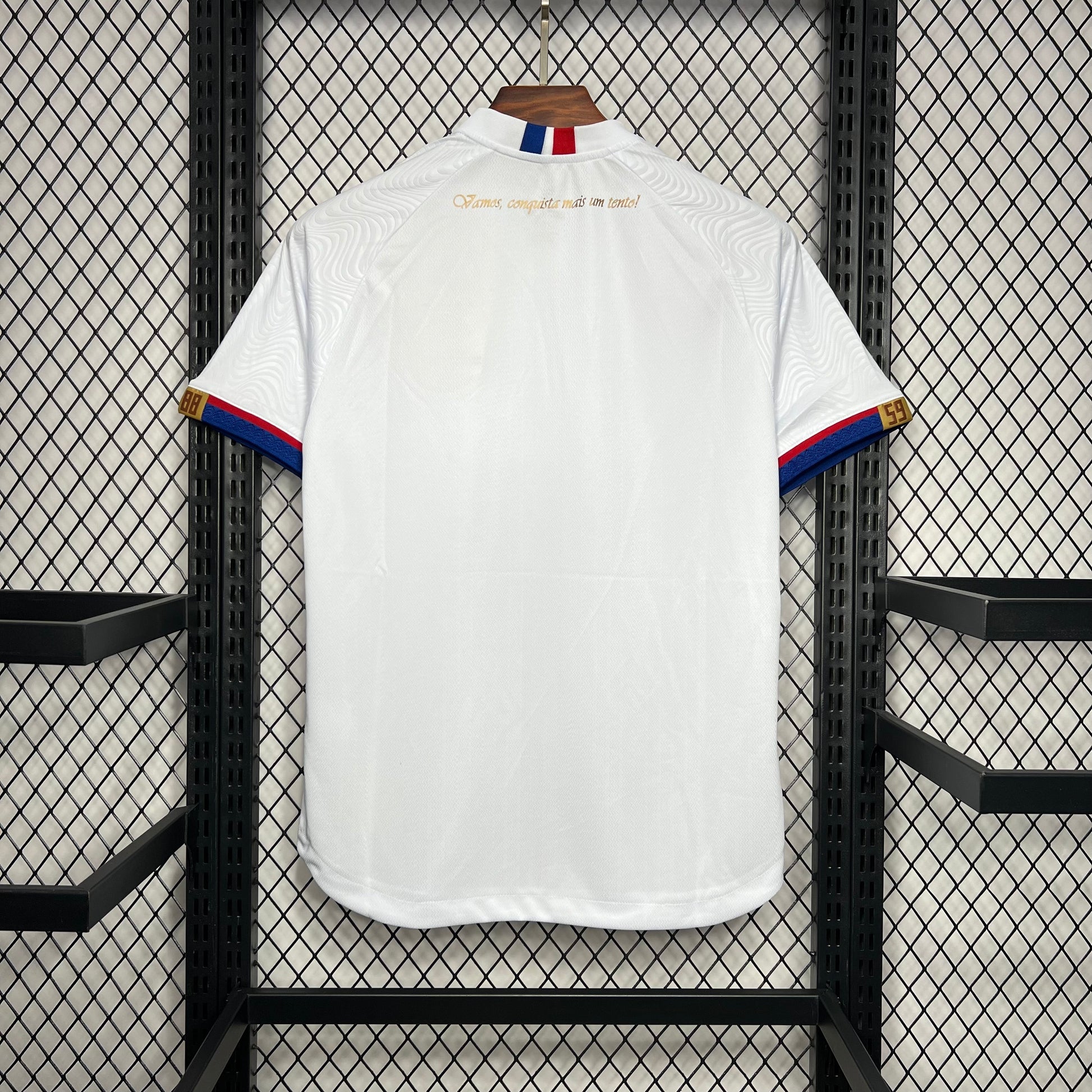 Detalhes Especiais: Logo da marca própria "Esquadrão" no lado esquerdo em dourado, gola em "V" com friso tricolor e punhos das mangas em azul vibrante.